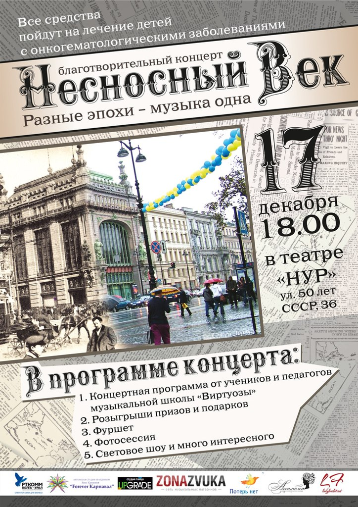 The program of thematic concert «Nesnosny Vek» includes performances of students and teachers of "Virtuosi" school, soloists of the Bashkir State Opera and Ballet Theatre Rezida Aminova and Albina Gabidullina, dance show of the «Upgrade» dance studio, of the "Assembly" historical dance studio. Part of the concert will be dedicated to the 18-19th centuries. Also at the charity event prize drawing from "Virtuosi" school and the music store "Zona Zvuka" will be organized. A lighting show and a photo shoot will be prepared for viewers.