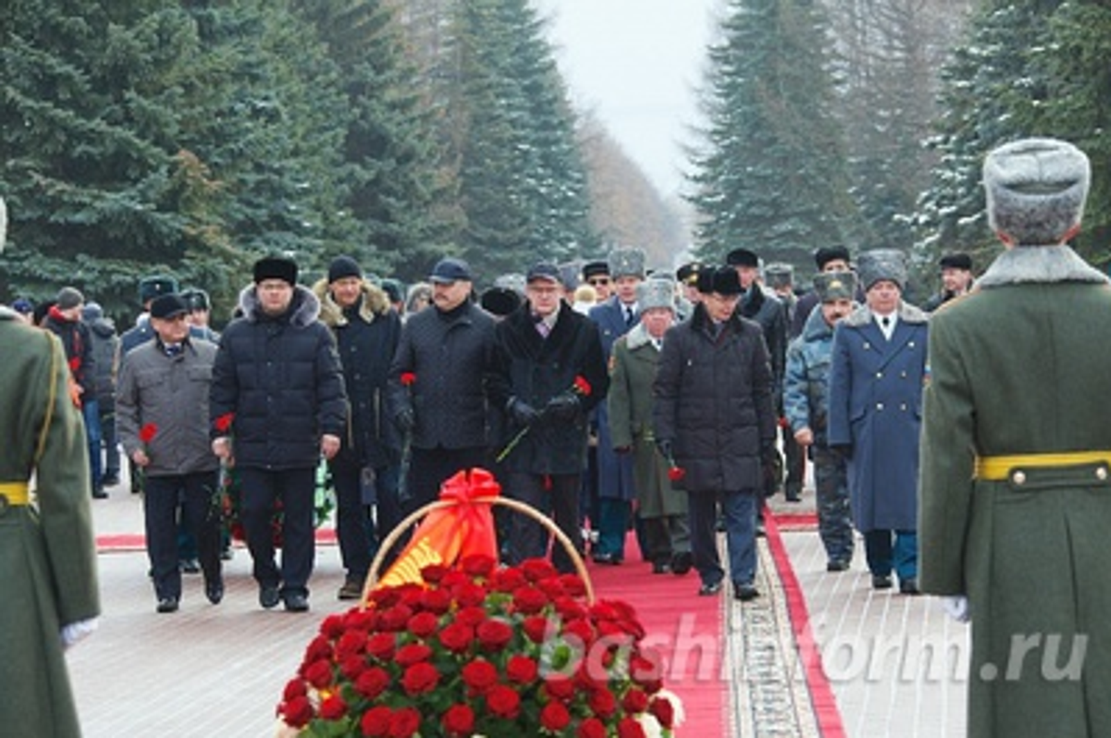 UFA, 24 February 2015. /Bashinform News Agency, Iliya Spiridonov/. On February 23, in Ufa the Head of Bashkortostan Rustem Khamitov took part in the ceremony dedicated to the Defender of the Fatherland Day. The Head of the Republic laid fresh flowers to the Eternal Flame at the monument to the Heroes of the Soviet Union Alexander Matrosov and Minnigali Gubaidullin in Victory Park.