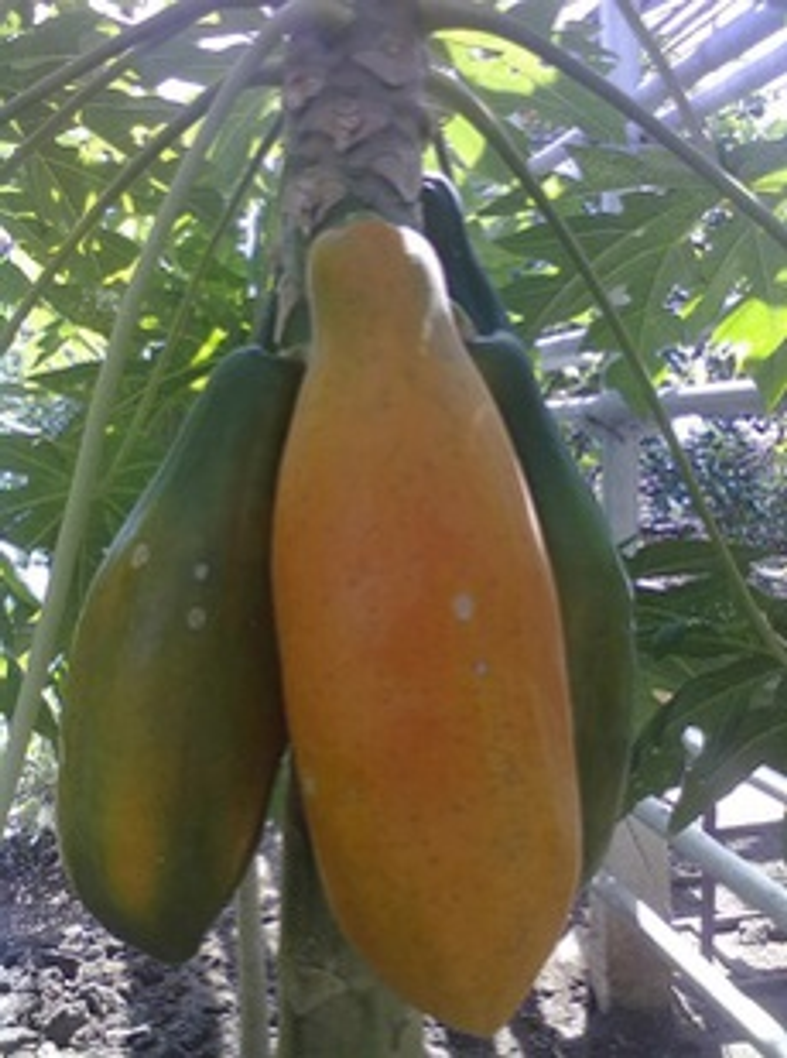 Papaya cannot be named a tree. Although, its second name is a melon tree. It looks more like a grassy tree-shrub. During flowering it fills the green-house with aroma of lily-of-the-valley blooming. Greenhouse famers wait harvest for a very long time - nearly 10 months. In tropical countries, the berries ripe more quickly, in just 4-6 months.