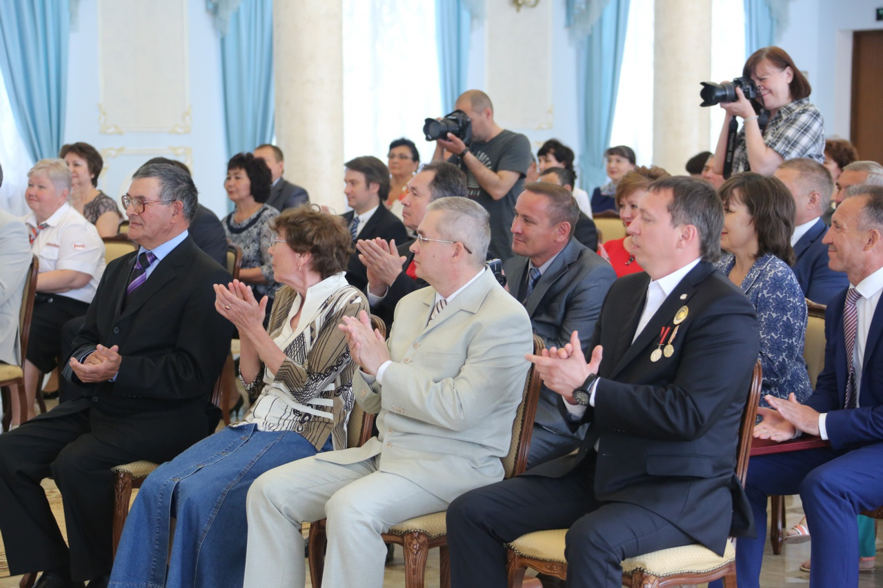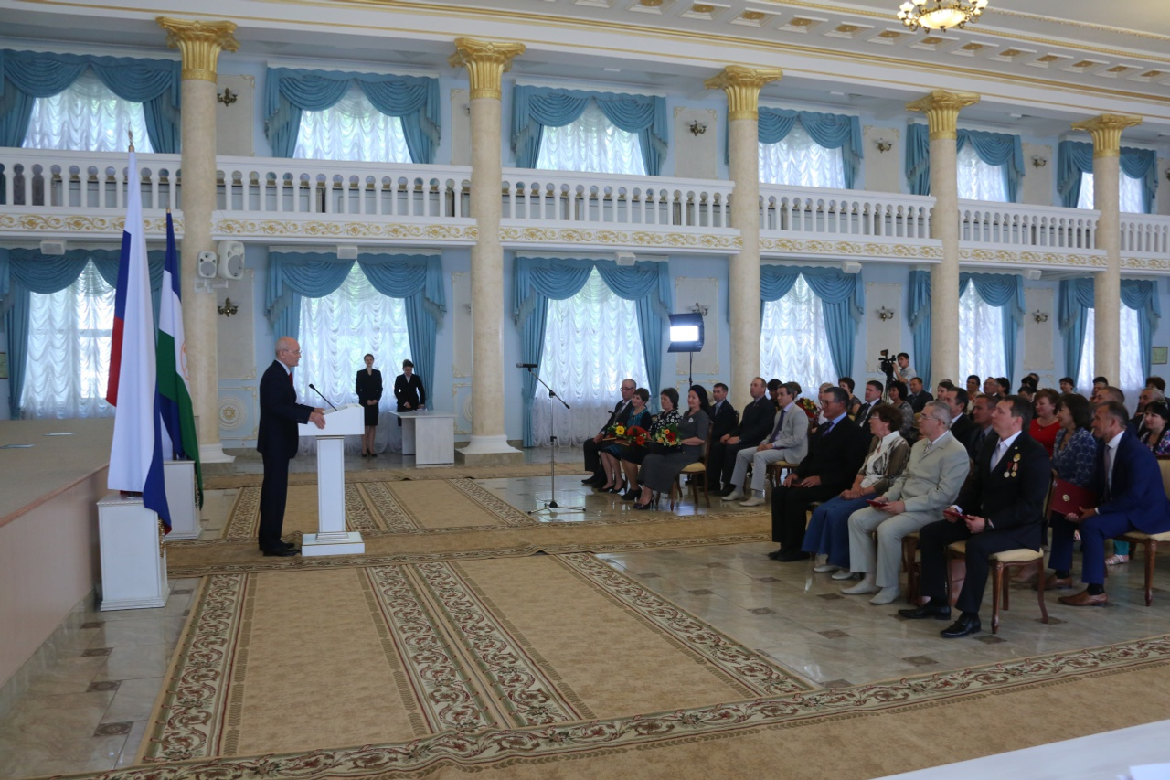 UFA, 29 May 2015. /Bashinform News Agency, Iliya Spiridonov/. On May 29 in Ufa, the Head of Bashkortostan Rustem Khamitov presented state awards of the Russian Federation and the Republic of Bashkortostan. 45 professional achievements of employees engaged in industry, energy, construction, agriculture, transport, social services, public service, municipal government, literature and the arts, culture, science and the media, as well as public figures were awarded medals, diplomas, certificates of acknowledgement and titles.