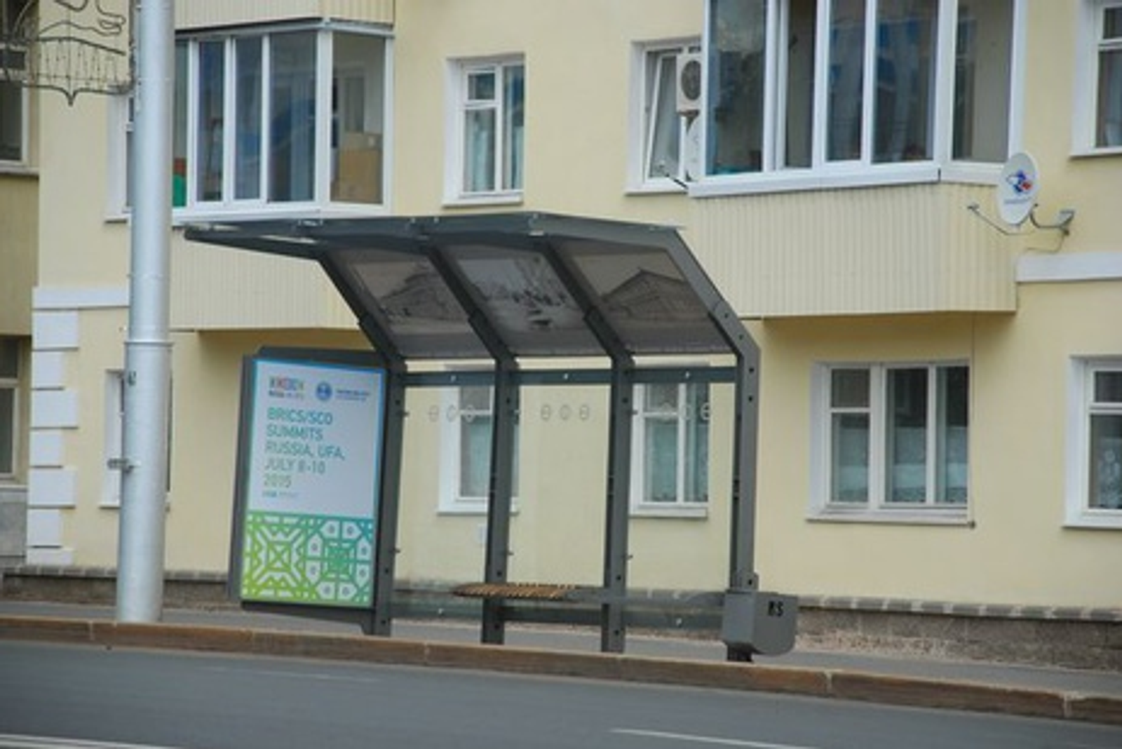 Light boxes are decorated with historic views of Ufa inside the bus stop shelter. They are illuminated at night by solar energy accumulated during the day.
