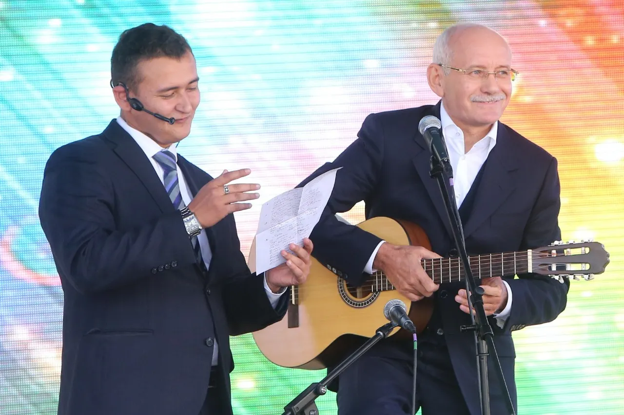 Students, in turn, presented Rustem Khamitov a guitar with university slogans written on it, and the Head of the Region played a song of his own composition about studying at the university.