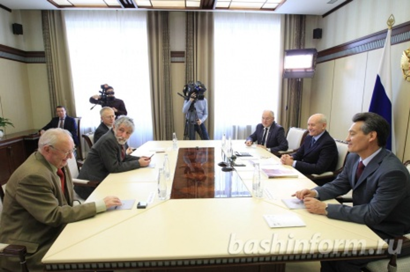 UFA, 20 November 2015. /Bashinform News Agency, Alexander Smirnov/. On November 19, at the House of the Republic the Head of Bashkortostan Rustem Khamitov met with the President of the Russian Society of Sociologists, Professor Valery Mansurov, Director of the Institute of Demography of the Higher School of Economics, Professor Anatoly Vishnevsky and Professor of Environmental Economics of Economics Faculty of Moscow State University Sergei Bobylev, who take part in the All-Russian research and practice conference "Human Capital Development as Modernization Factor of Russia and its Regions" held in Ufa.