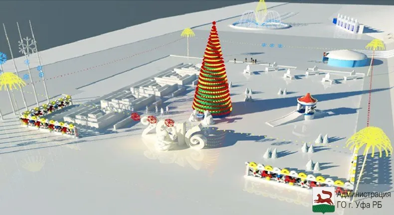 A 25-m spruce brought from Nuriman region has been already installed in front of the Congress Hall. It’s decorations are started. The venue will be designed in the traditional style of the Eastern calendar. Ice slides, a maze and a structure imitating a fountain will appear there.