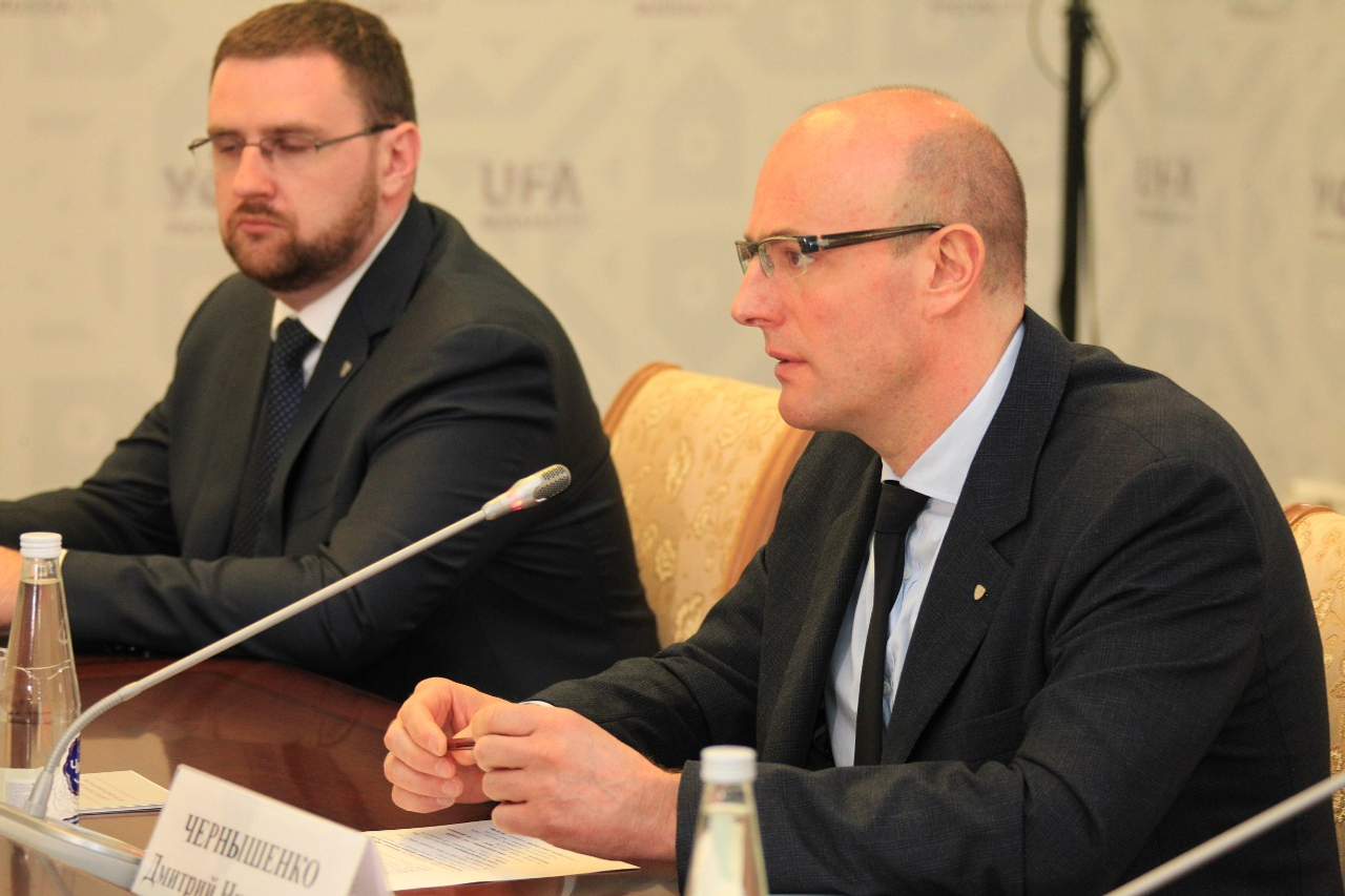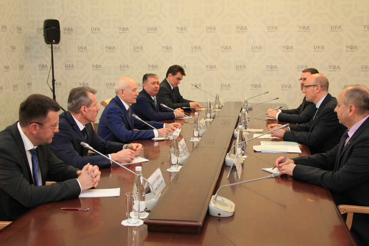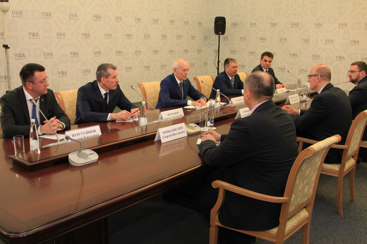 UFA, 6 May 2016. /Bashinform News Agency, Alexander Smirnov/. On May 5 in Ufa, the Head of Bashkortostan Rustem Khamitov met with the President of the Kontinental Hockey League Dmitry Chernyshenko. During the meeting the sides discussed issues of preparation for the Kontinental Hockey League All-Star Game in 2017 in Ufa.