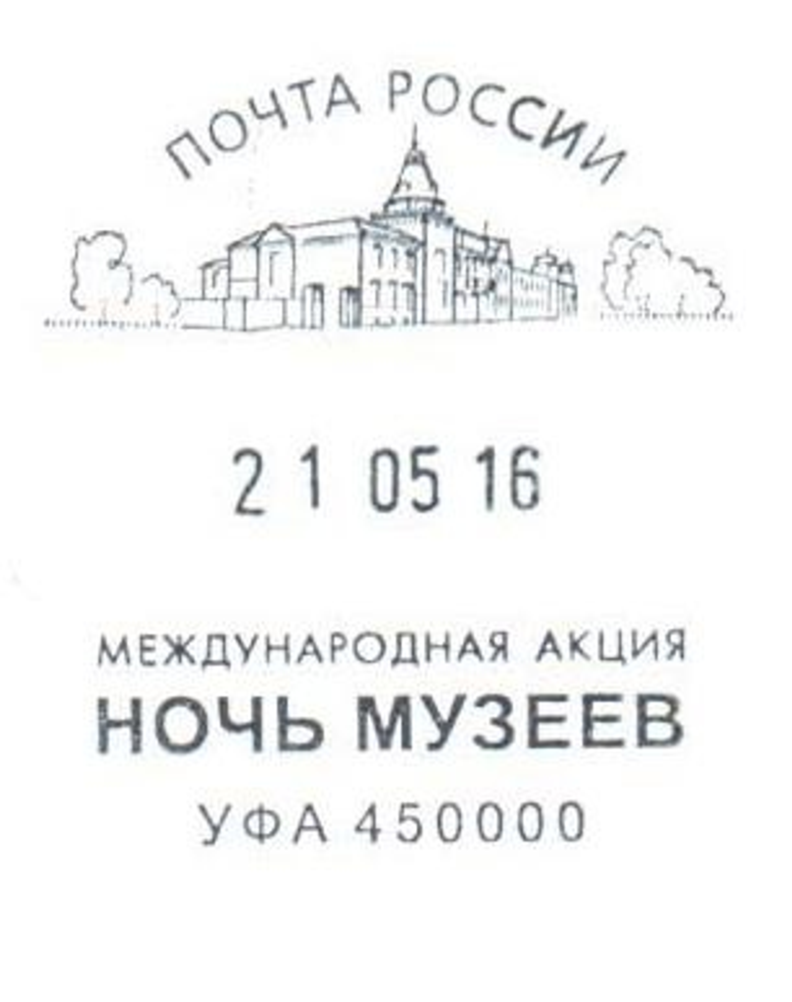UFA, 17 May 2016. /Bashinform News Agency, Olga Murtazina/. The Bashkir Branch of the Russian Post on the eve of the international "Night of Museums" campaign has produced a corresponding postmark. It is still the only one in the country, the press service of the company informs. The print was executed by the publishing centre "Marka".