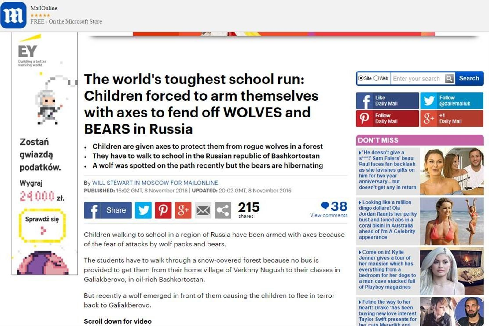 UFA, 10 November 2016. /Bashinform News Agency, Ksenia Kalinina/. Bashkir pupils armed with axes have become famous all over the world. Video of children going to school through the forest was posted in the foreign media. The major British newspaper Daily Mail published an article and a video entitled: The world's toughest school run: Children forced to arm themselves with axes to fend off WOLVES and BEARS in Russia.