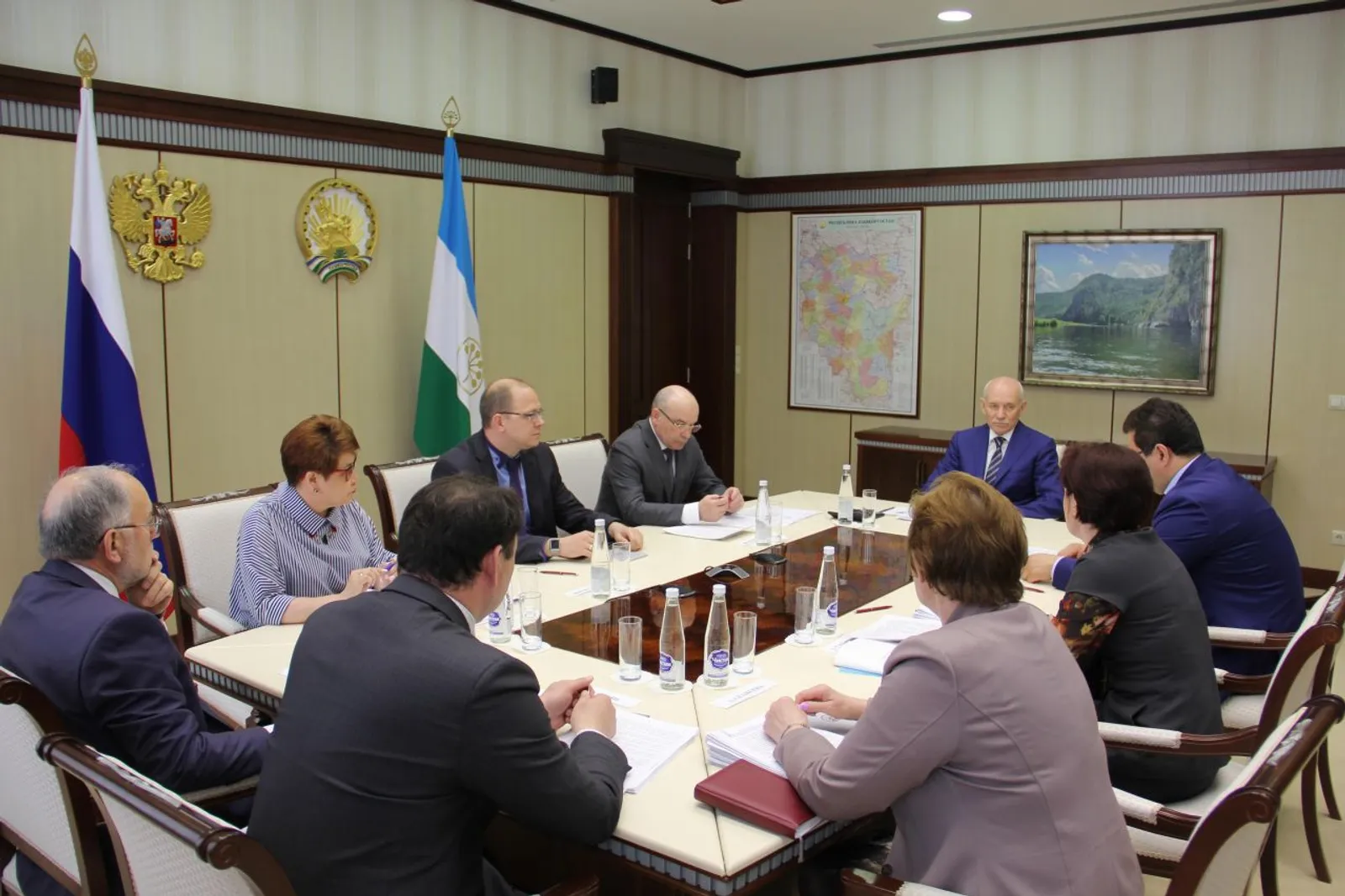 UFA, 15 June 2017. /Bashinform News Agency/. The Head of Bashkortostan Rustem Khamitov held a meeting on teaching state and native languages in the region. Members of the Government of the Republic of Bashkortostan, heads of relevant ministries and departments, representatives of the scientific community took part in it.