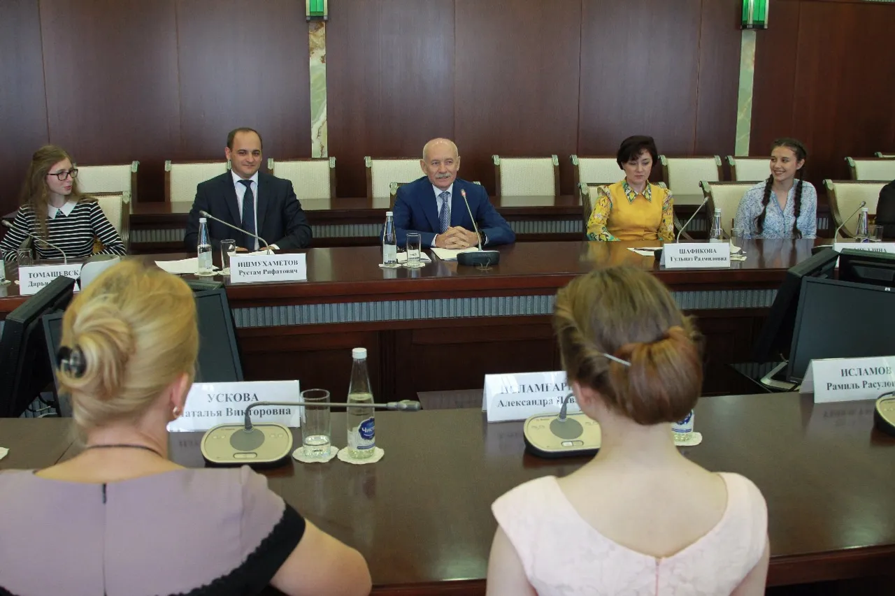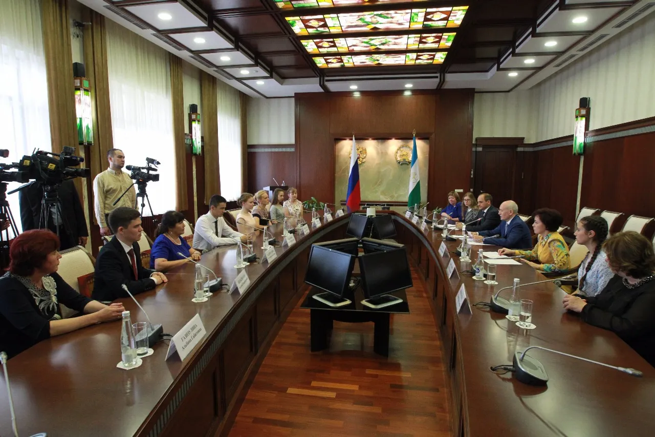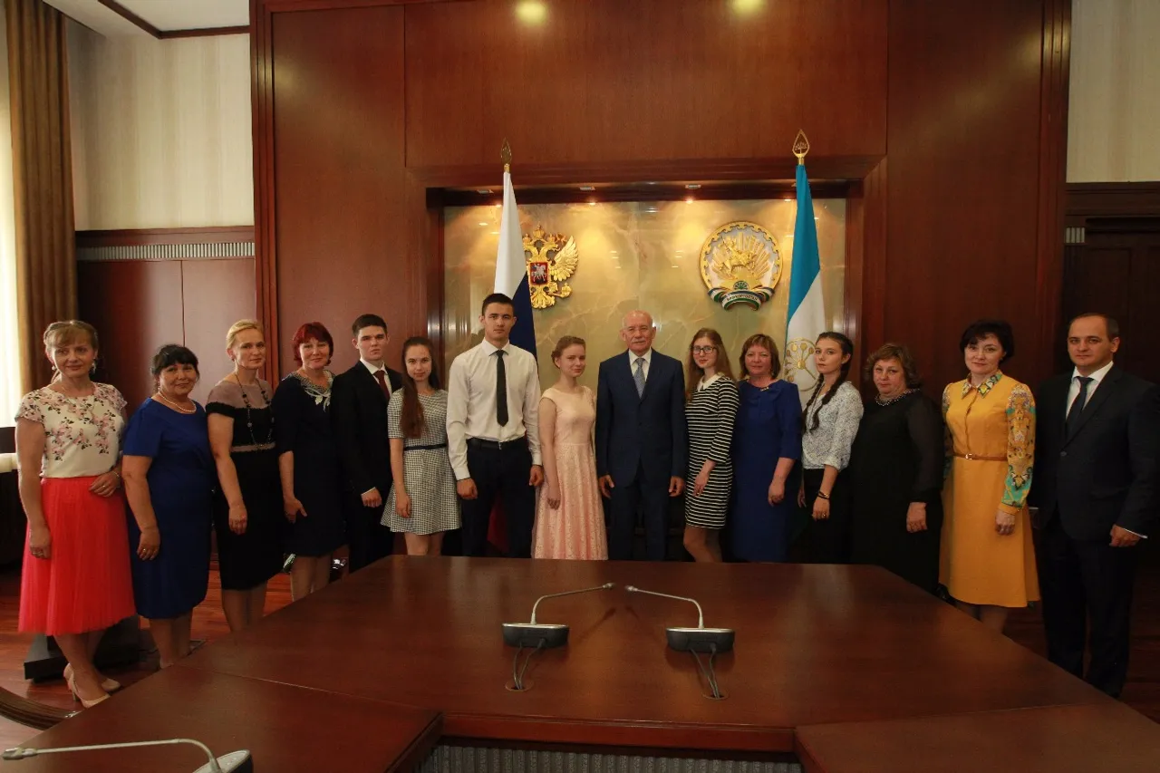 UFA, 5 July 2017. /Bashinform News Agency/. The Head of Bashkortostan Rustem Khamitov met with graduates of schools who passed the Unified State Exam with 100 points. The Minister of Education of the Republic of Bashkortostan Gulnaz Shafikova and the class leaders of these pupils also took part in the meeting.