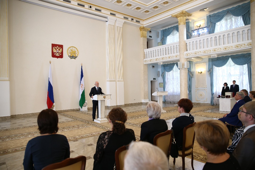 UFA, 9 October 2017. /Bashinform News Agency/. The Head of Bashkortostan Rustem Khamitov presented state awards of the Russian Federation and the Republic of Bashkortostan on the eve of the Republic Day. Orders, honorary commendations, titles and letters of appreciation were handed over to 47 employees representing different sectors of the regional economy for their professional achievements. Among the awardees there were also public figures and guardians of troubled children.