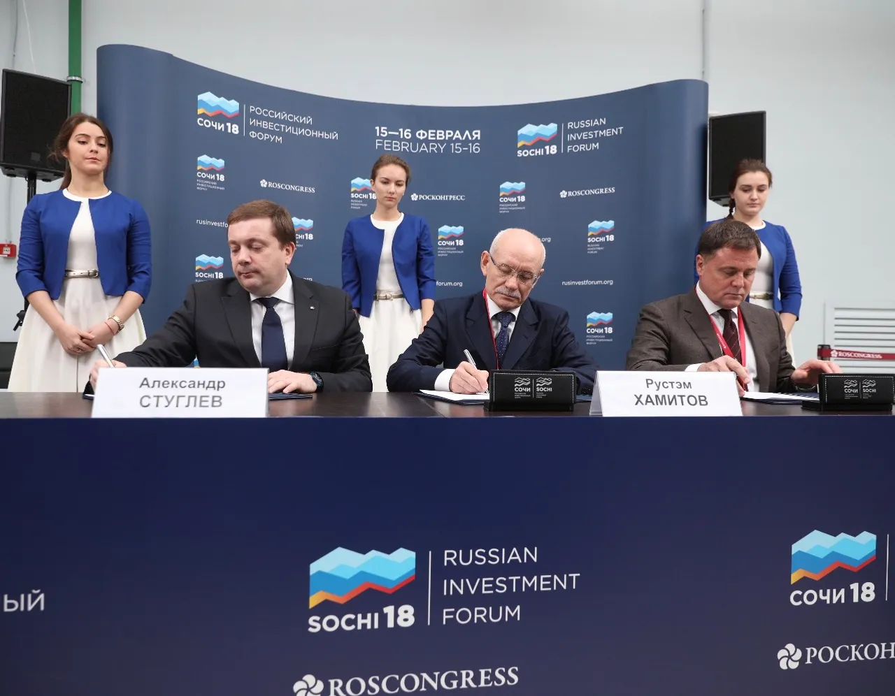 UFA, 15 February 2018. /Bashinform News Agency/. An agreement on cooperation between the Roskongress Fund, the Government of Bashkortostan and the All-Russian Public Organization "Association of Lawyers of Russia" is signed at the Russian Investment Forum «Sochi-2018».
