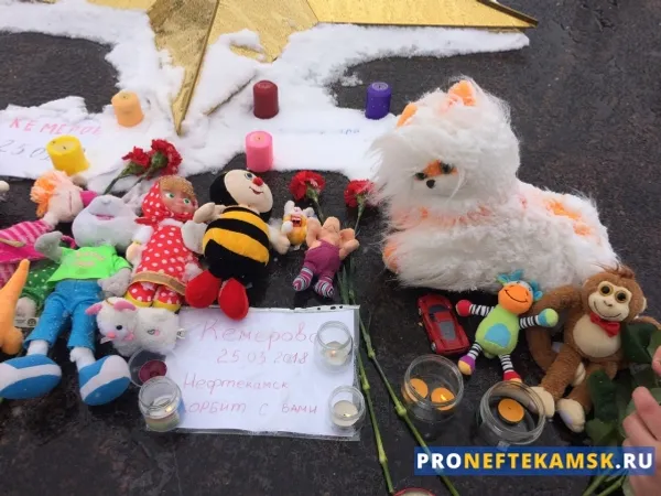 In memory of the victims of the fire in Kemerovo, a memorial was organized by residents of Neftekamsk too. The townspeople bring flowers, toys, and candles.