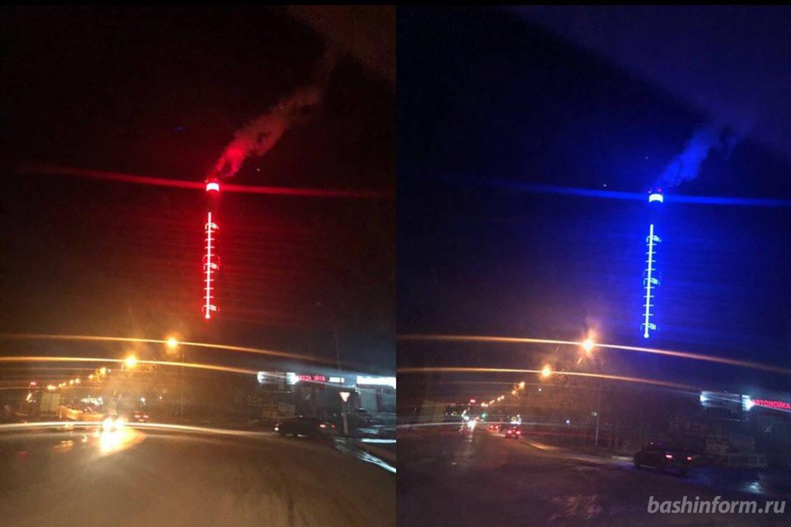 UFA, 12 April 2018. /Bashinform News Agency, Ksenia Kalinina/. In Ufa, commissioning of a giant thermometer is being completed on the boiler room chimney in Mendeleev Street. Now tests are carried out on illumination, thus the lighting of the thermometer will be switched on in the morning and not at night.