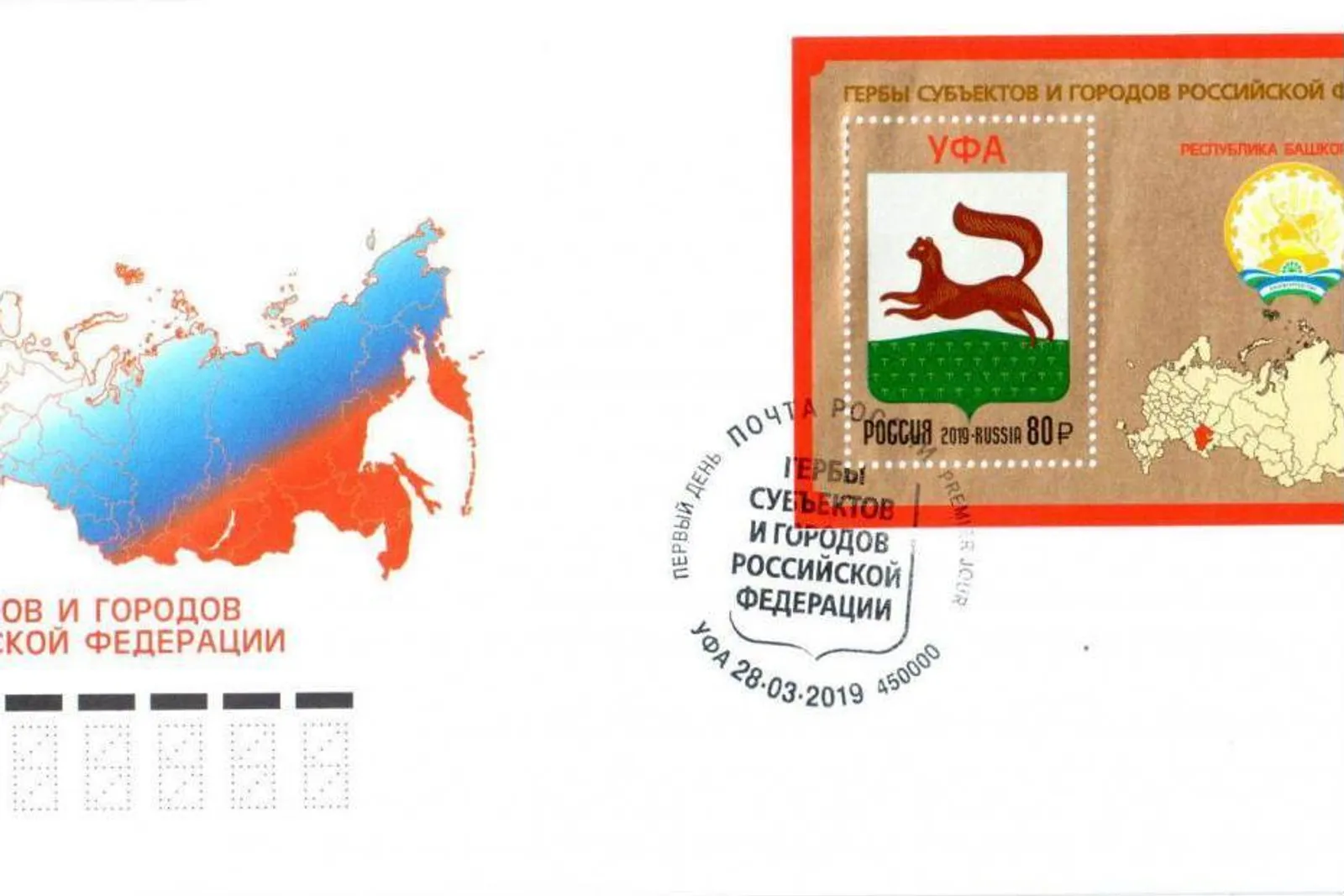The postage stamp depicts the coat of arms of the city of Ufa, the coat of arms of Bashkortostan and the map of the Russian Federation. The stamp is issued on March 28 at the Ufa Post Office.