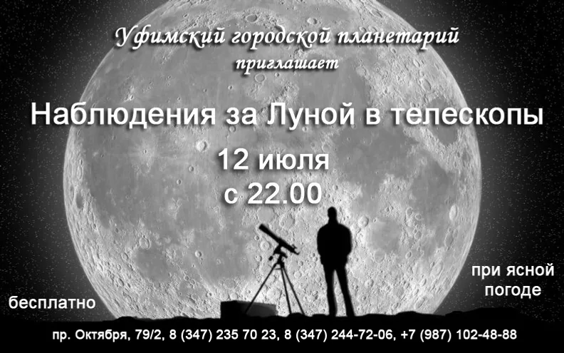 On the anniversary of the flight on the night of July 12-13, the whole planet will be observing the moon through telescopes at the initiative of French scientists. The Ufa City Planetarium also takes part in the campaign called “On the moon again” and invites everyone on Friday, July 12 to look at our satellite, as well as on Jupiter through telescopes.