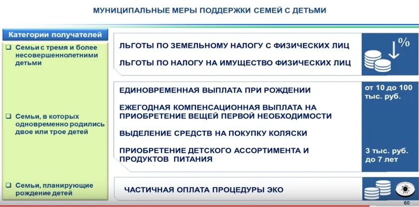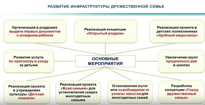The program involves the development of family-friendly infrastructure: open maternity hospitals, convenient children's medical examinations, more after-school centers, discounts for large families for travel tickets, theater tickets, and others.