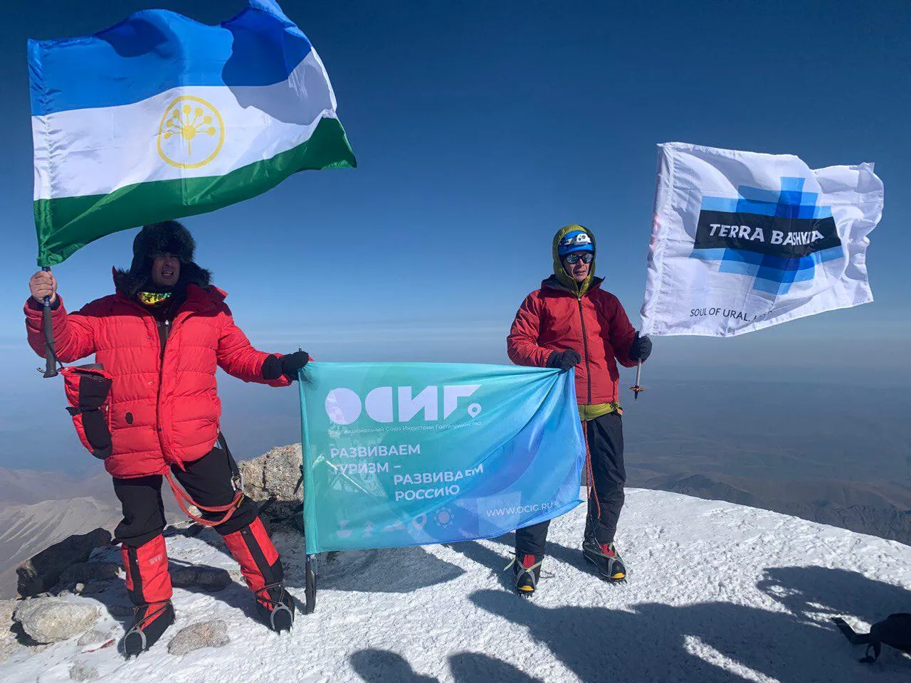 The state flag of the Republic of Bashkortostan, the flag with the TERRA BASHKIRIA logo, and the flag of the National Union of the Hospitality Industry (OSIG) were unfurled on Elbrus. Elbrus is the highest peak in Russia, with a height of 5642 meters.