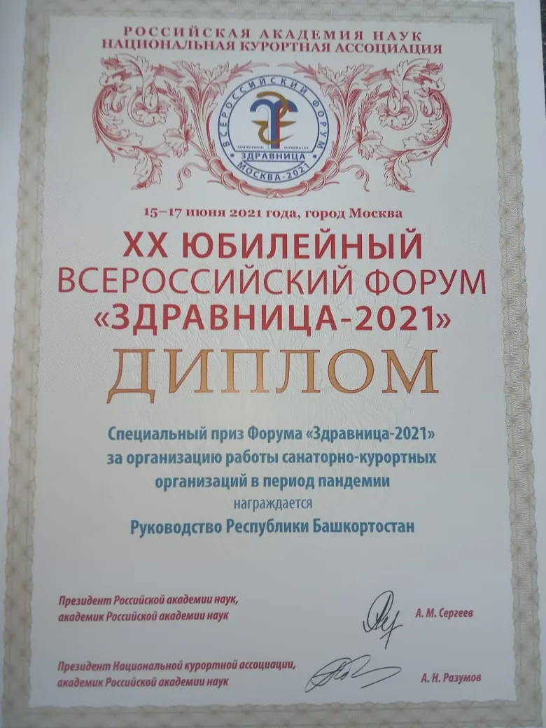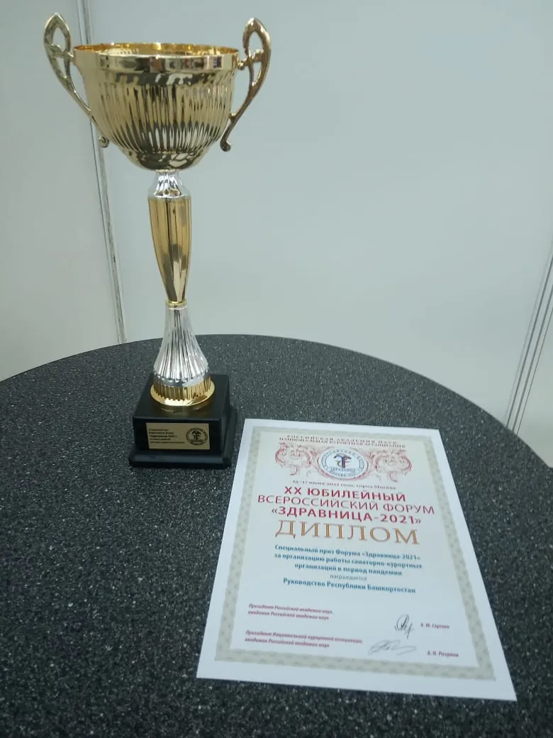 The leadership of the Republic of Bashkortostan was awarded a special prize for organizing the work of health resort organizations during a pandemic at the largest health resort forum, "Zdravnitsa-2021". A commemorative cup and a diploma were presented by the President of the National Resort Association, Academician of the Russian Academy of Sciences Alexander Razumov.