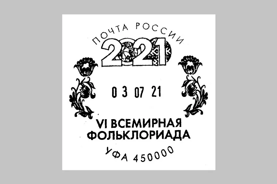 Simultaneously with the envelope, a special postmark was issued with the transfer date and the emblem of the VI World Folkloriada. It will be officially introduced into the postal circulation just before the grand opening of the international festival in the Ufa-Arena on July 3, 2021, where a special cancellation of postage will take place. Customers of the Russian Post can put an imprint of a special stamp on outgoing items after the end of the ceremony at the central post office during its opening hours.