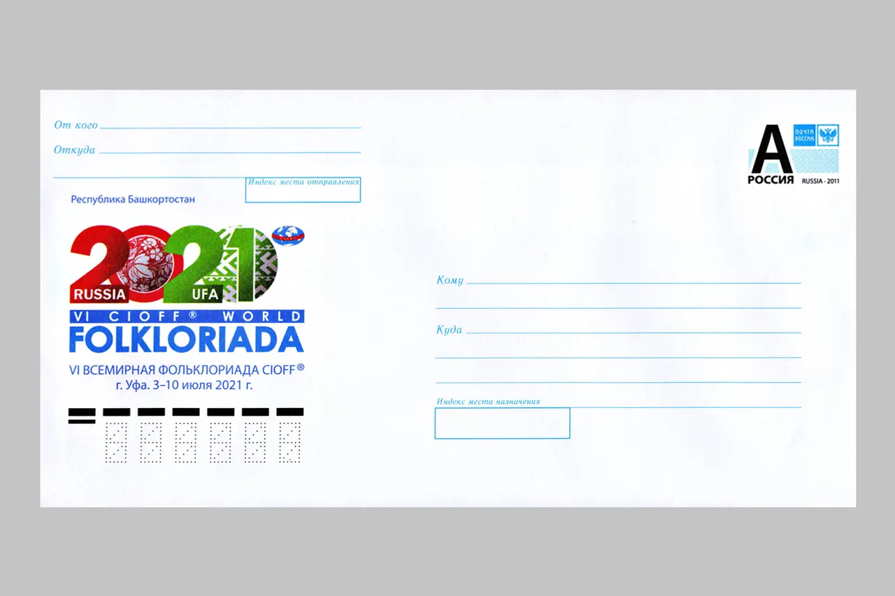 The thematic envelope depicts the emblem of the international festival and contains the inscription “Republic of Bashkortostan. VI World Folkloriada CIOFF® Ufa, July 3-10, 2021".