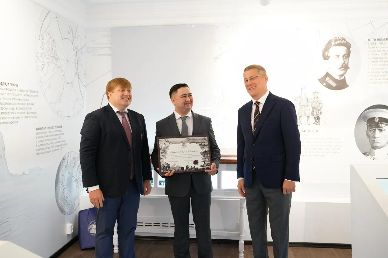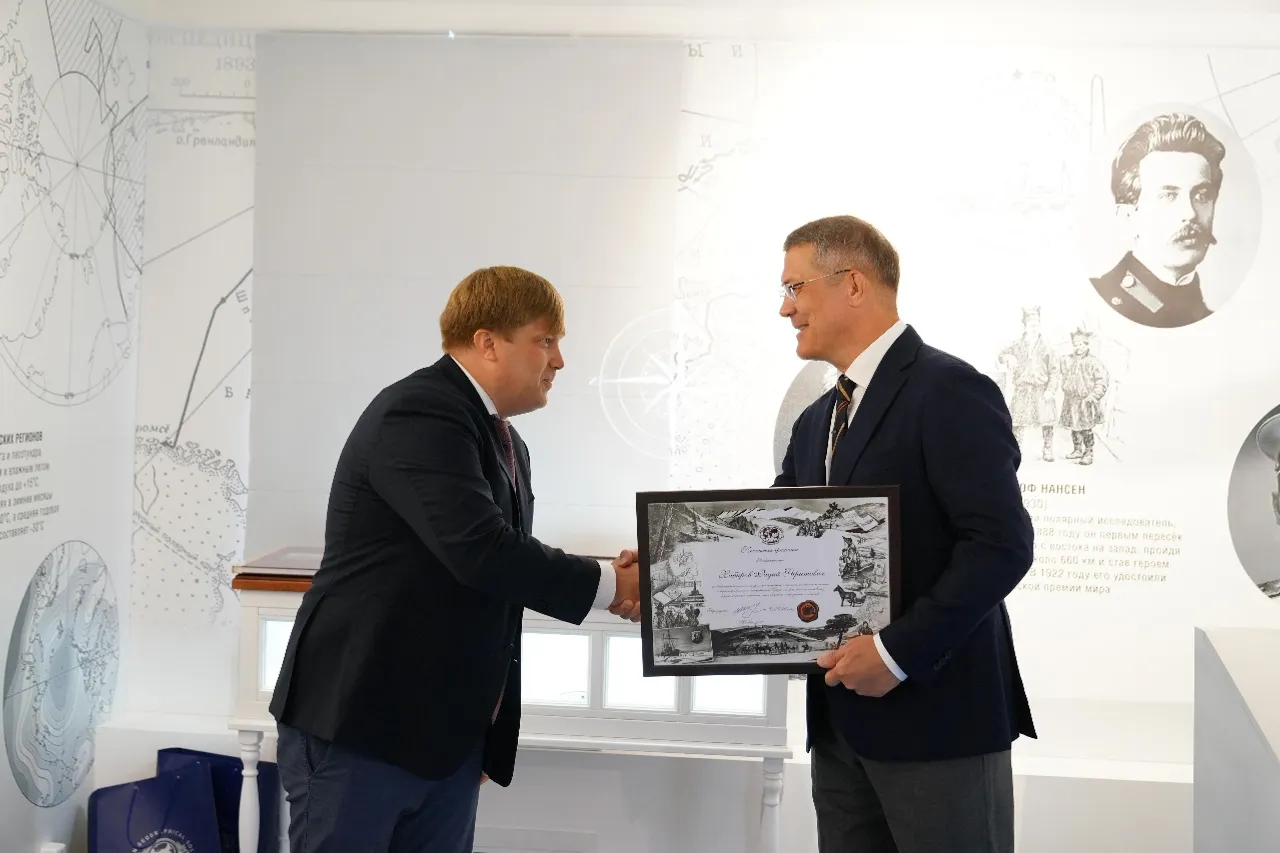 Sergey Korlykhanov also presented the Head of Bashkortostan, Radiy Khabirov, with an honorary diploma from the President of the Russian Geographical Society, Minister of Defense of Russia Sergey Shoigu, for his active work in popularizing geography, preserving the historical memory of the discoverers and explorers of the North, as well as a significant contribution to achieving the goals and solving problems of the Russian Geographical Society.