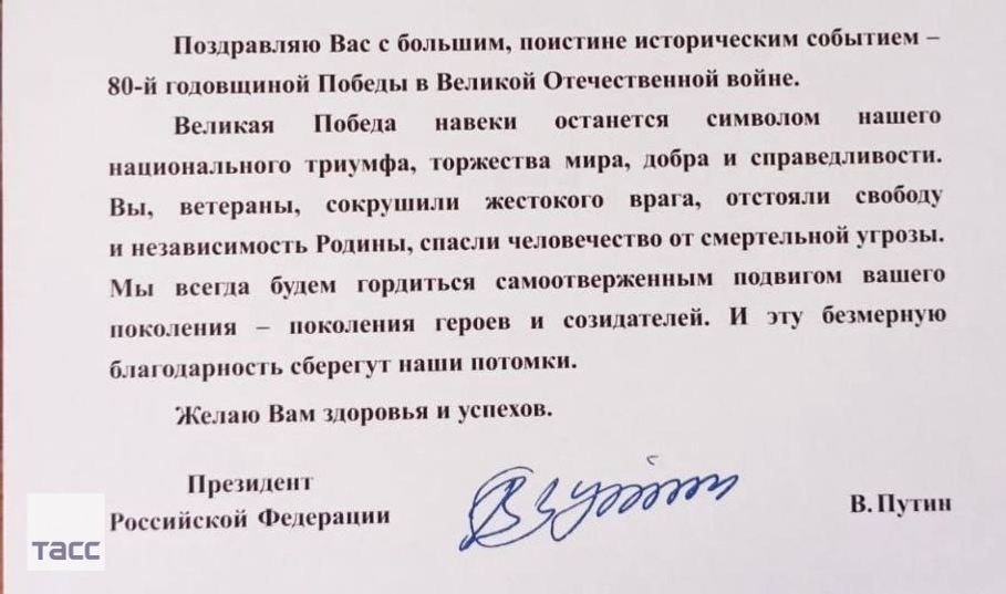 "I congratulate you on a great, truly historic event—the 80th anniversary of Victory in the Great Patriotic War. The Great Victory will forever remain a symbol of our national triumph, the triumph of peace, goodness, and justice. You, veterans, crushed the cruel enemy, defended the freedom and independence of the Motherland, and saved humanity from a mortal threat.