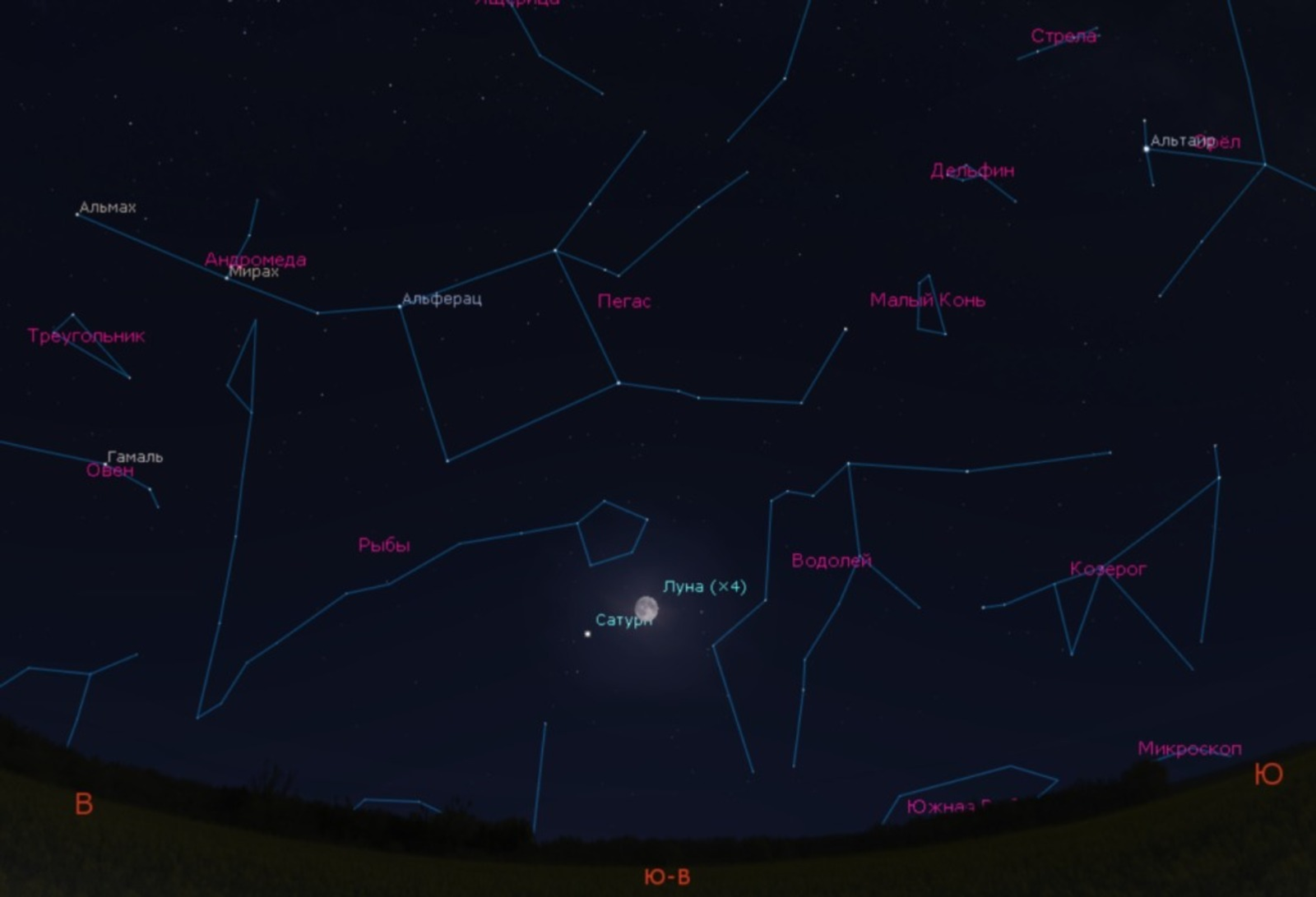 They will rise almost simultaneously above the horizon: the Moon at 18:11, followed by Saturn 16 minutes later. In the evening, they will appear low above the southeastern horizon. By midnight, they will reach their highest point at 32 degrees above the horizon, visible in the southern sky.