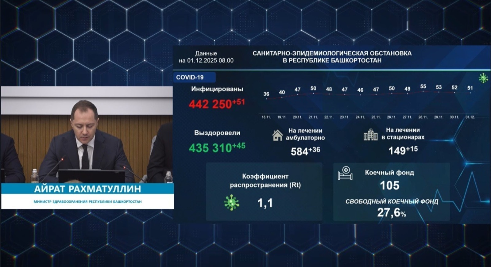 In Bashkiria, 51 new cases of the novel coronavirus infection were detected over the past 24 hours. The latest data was shared on December 1 at the government's operational meeting in the Situation Center by the republic's minister of health, Ayrat Rakhmatullin.