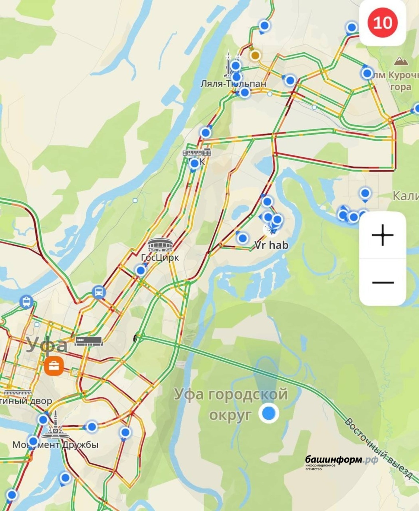 Due to heavy snowfall, Ufa has been paralyzed by 10-point traffic jams. The most difficult situations are observed at the city entrances from the airport and Zaton, as well as along Pugachev and Perspektivnaya streets. Congestion has gripped M. Zhukov, R. Sorge, Tsyurupa, Kirov, Ayskaya, 50 Let SSSR, and Kolguevskaya streets, as well as Oktyabrya and Salavat Yulaev avenues.