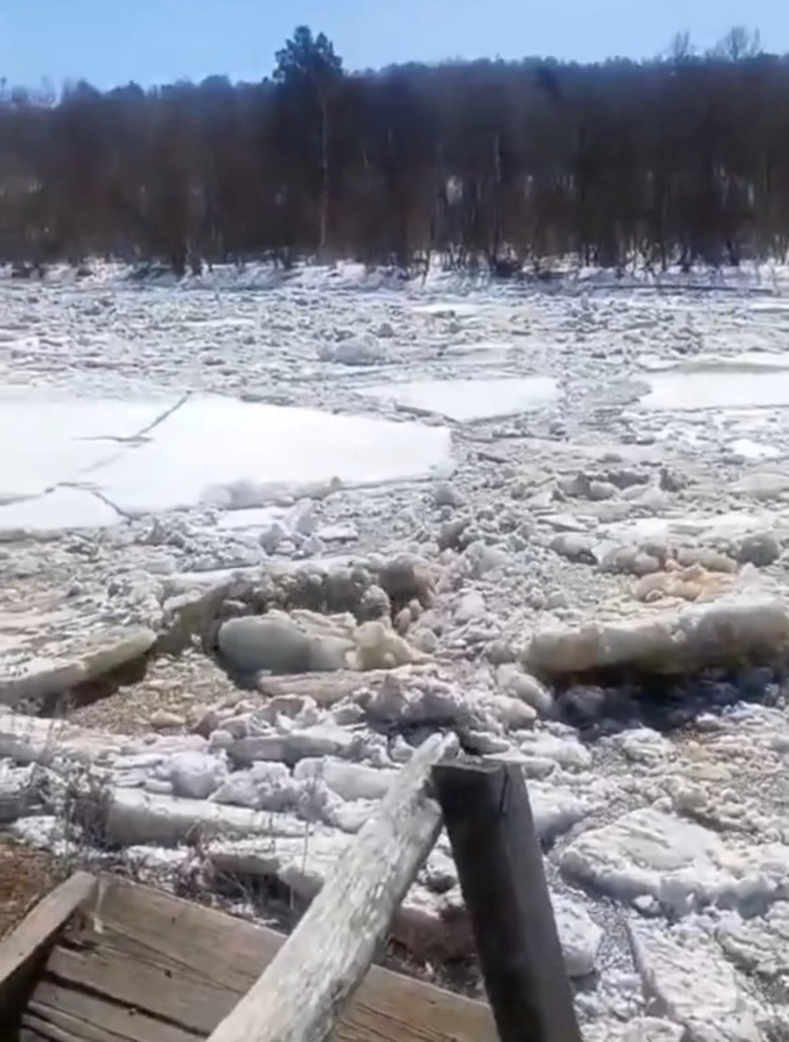 The river has begun to clear of ice, and this process was captured on video.