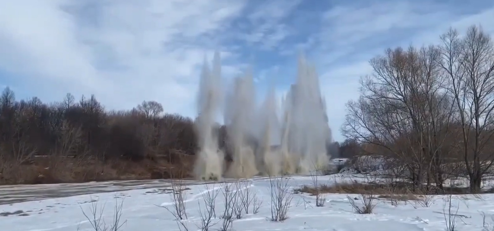 Yesterday on the Syun River in the Ilishevsky District, blasters and rescuers conducted the last preventive ice blasting of the season. This was the final action in a series of works aimed at preventing floods.