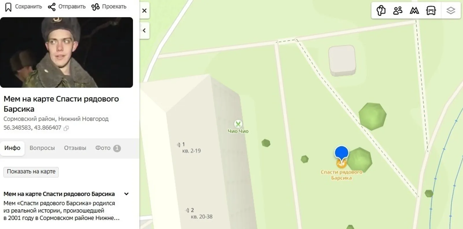 The geolocation of the place where the famous internet meme 'Saving Private Barsik' originated has been added to the 2GIS map in Nizhny Novgorod. The point is located in the courtyard of a building on Pavel Mochalov Street.