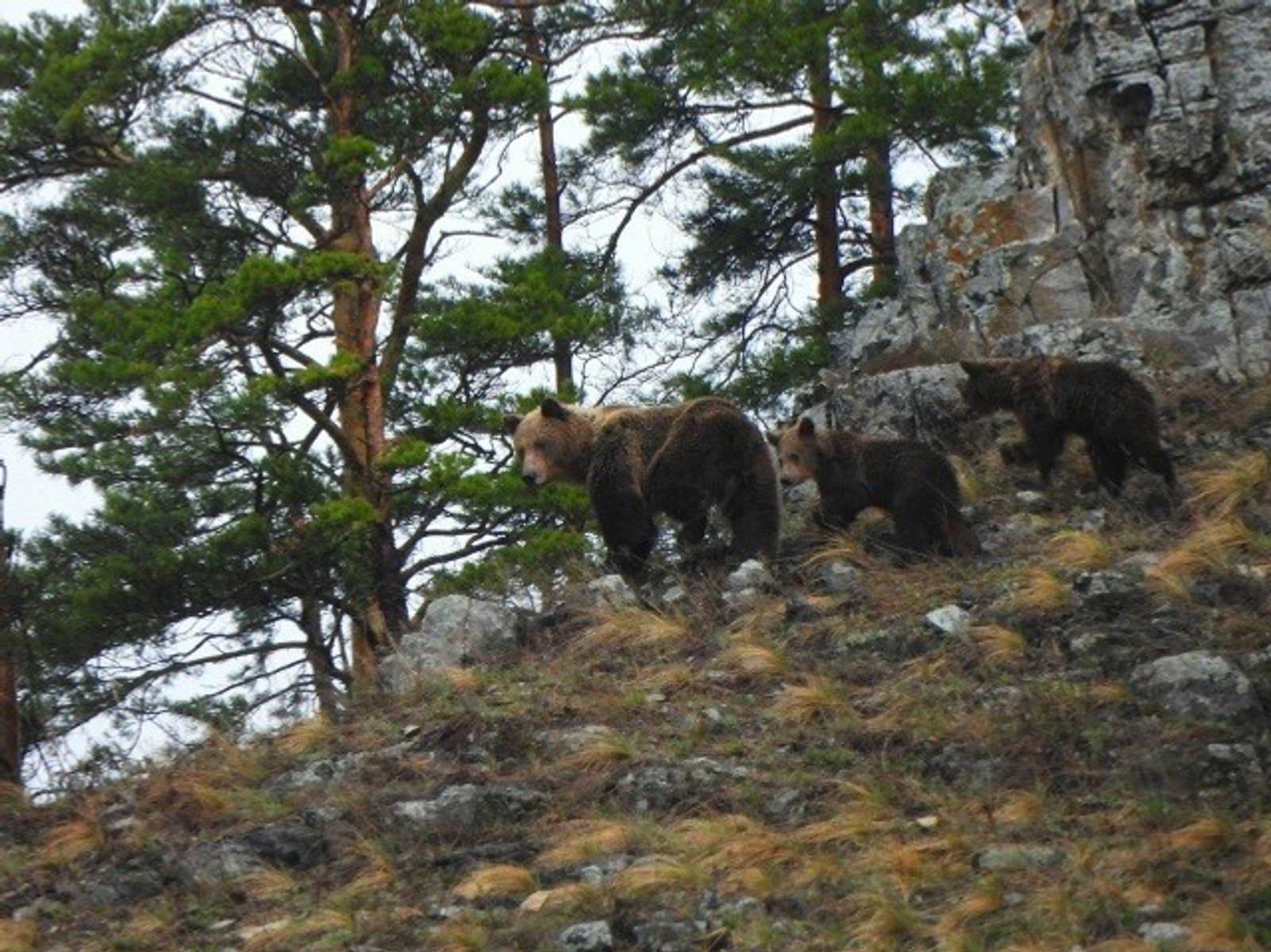 A mother bear with two yearling cubs emerged from her den in the "Bashkiria" national park. A photo was published on social media.