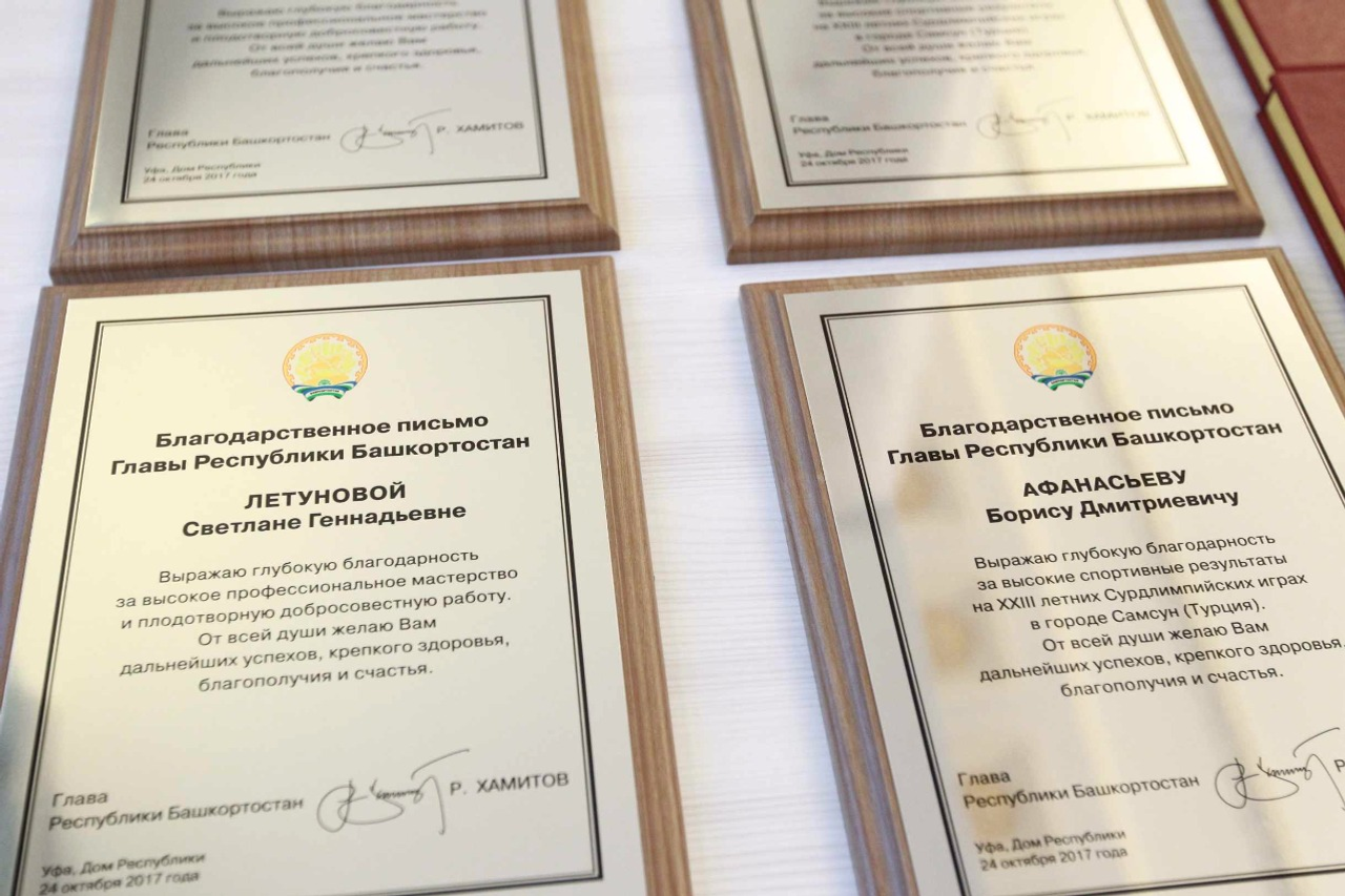 UFA, 29 November 2017. /Bashinform News Agency, Natalia Ovcharuk/. On November 29, the Prime Minister of the Government of Bashkortostan Rustem Mardanov presented state awards to directors of sports schools, coaches and participants of the 23rd Deaflympics Summer Games in a solemn atmosphere. From the Turkish city of Samsun, ten Bashkir athletes with disabilities brought 11 medals: four gold (two in judo, two in athletics), six silver medals (five in judo, one in badminton) and one bronze in judo.