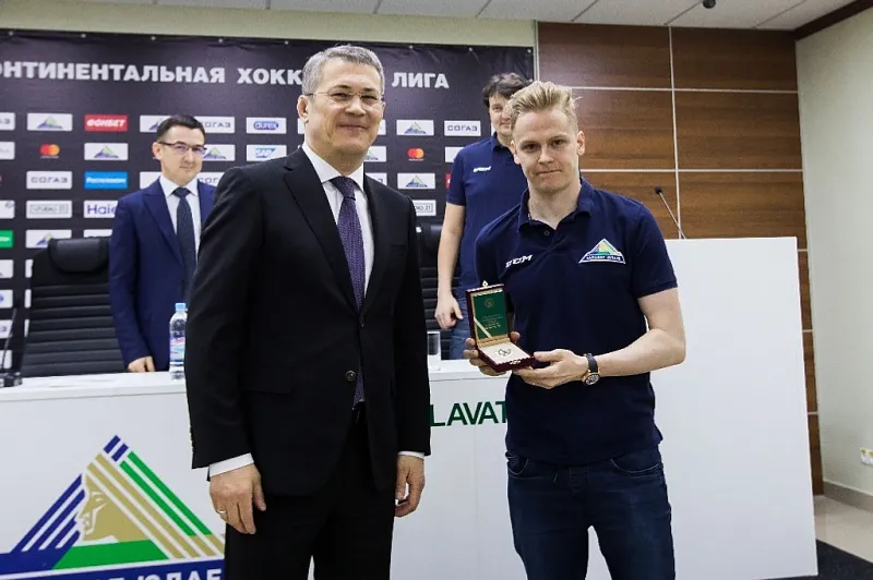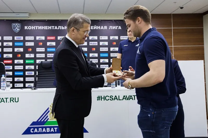 The Acting Head of Bashkortostan handed over the goalkeeper of Salavat Yulaev Juha Metsola the Order of Salavat Yulaev, and the forward Teemu Hartikainen - the Order of Merit for the Republic of Bashkortostan. Radiy Khabirov received a hockey stick with autographs of all the players of the club as a gift from the team.