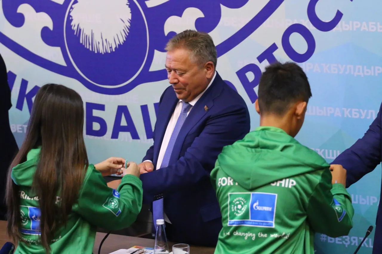 The main sign of the “Football for Friendship” project is a blue-green bracelet. The ambassador of the tournament Anagni Cambodia, the Ufa mayor Ulfat Mustafin and president of the International Children's Games committee Thorsten Rush, received them in memory of the project in the capital of Bashkortostan.