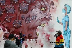 Ufa designer animated coronavirus graffiti opposite Republican Clinical Hospital